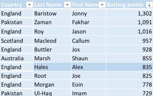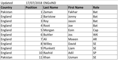 When I created the index I did expect a country or two to have three players or so in the ODI XI but little did I expect that the team will have representation from only two countries and that too nine players from England. Fakhar Zaman and Baristow were the openers with the highest points. Number three has been held strongly by Callum Macleod but Roy is too devastating a player to lose out. Further Macleod will be removed from the index and table in a few matches. Due to this I decided to give him a graceful retirement. I hope to see him back once Scotland plays two more games. Root has been doing extremely well. He has scored more total points than Marsh. Four is still high enough for Root to build an innings.