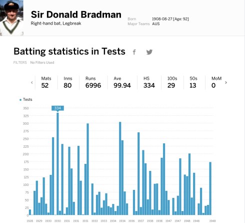 August 27th was the birthday of the great Sir Donald Bradman. His test average of 99.94 is the holy grail of cricket. It would make sense to use Don Bradman as a benchmark for batting. His performance is beneath
