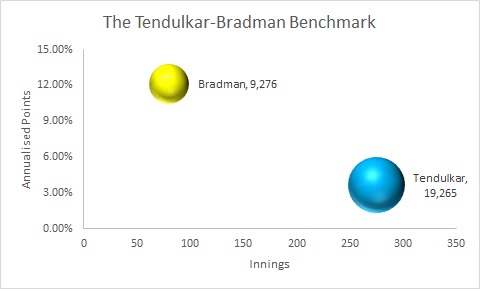 This graph represents the Tendulkar-Bradman Benchmark where the size of the bubble represents the points, the X-axis the innings played (as opposed to the games) and the Y-axis is the annualised points. I expect players to fall within this range. Adding the innings played to the points gives an additional dimension and context of the game. The test of a good benchmark is whether they can accurately place the performance of a player which is something I will be doing and I am confident that players, irrespective the era they played in will be accurately reflected in this graph.