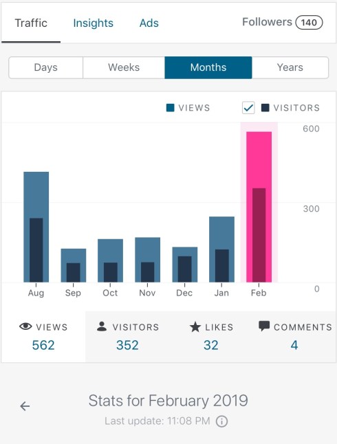 Insights show the postings and views throughout the year by month or day. It also shows the most popular day and most popular hour. Insights also show the views per tags and categories although I personally feel that this particular statistic can be slightly misleading. The annual site stats is extremely helpful. Below are my stats for 2019