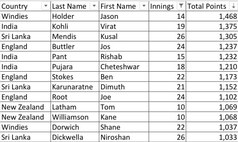 This is the last Test series of the season apart from the one of Test between Afghanistan and Ireland. I will not be surprised if both the series finish on the same day. The selection of Bangladesh confounds me. I had written a post on the end of specialists. However, Bangladesh takes that to a whole new level. New Zealand played with beauty and grace. The match also showed why Kane Williamson was ranked by every list except mine at the No.3 position for 2018. There are two matches left. It is highly possible that Williamson will be able to overtake Pujara. I estimate that Pujara will need to score between 130 and 170 runs to take the no. 3 slot in my Test XI. I am not a betting man but if I was then I probably would put my money on Williamson getting that no.3 slot. More importantly, he would have done it in fewer innings than Pujara.