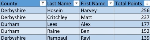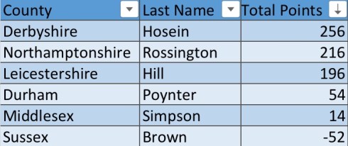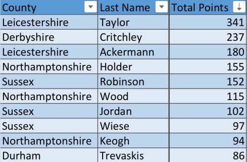 Middlesex has scored more points based on my system but in the official tables, they scored fewer points than Northamptonshire because they did not get any of the bonus points. I actually like the bonus system of County Cricket. It incentivises teams to aim for a realistic target based on international levels while giving bowlers a huge impetus too.